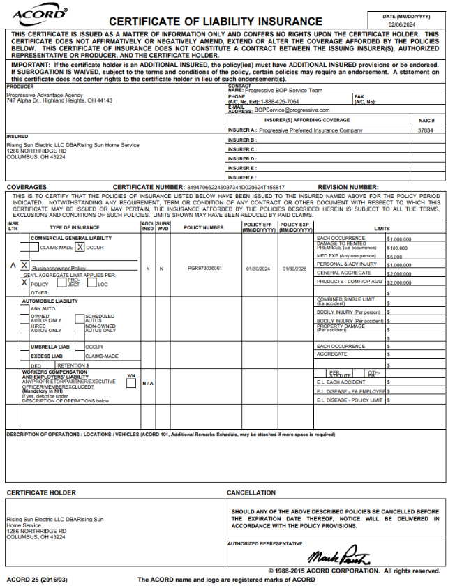 Have you hired or worked with Rising Sun Electric? Please let us know your experience.